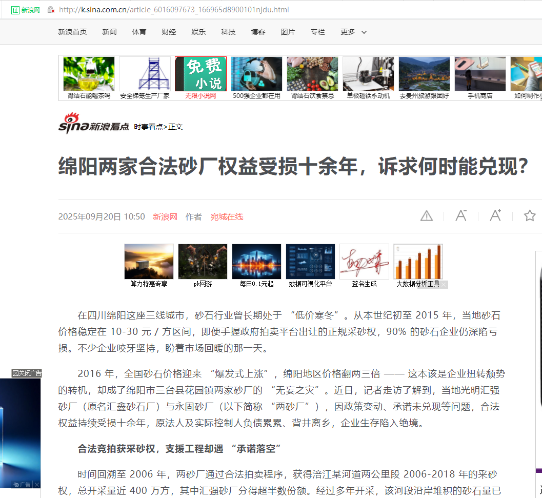 2016 年,全国砂石价格迎来 “爆发式上涨”,绵阳地区价格翻两三倍 —— 这本该是企业扭转颓势的转机,却成了绵阳市三台县花园镇两家砂厂的 “无妄之灾”。近日,记者走访了解到,当地光明汇强砂厂(原名汇鑫砂石厂)与永固砂厂(以下简称 “两砂厂”),因政策变动、承诺未兑现等问题,合法权益持续受损十余年,原法人及实际控制人负债累累、背井离乡,企业生存陷入绝境。