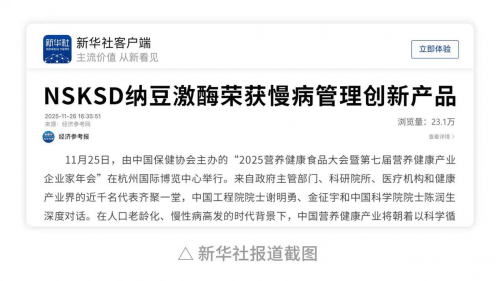 据新华社客户端报道,NSKSD纳豆激酶在前不久召开的2025营养健康食品大会,荣获由国家科技部认证机构颁发的“慢病管理心脑血管创新产品”奖,获此殊荣的是日生研生命科学(浙江)有限公司。