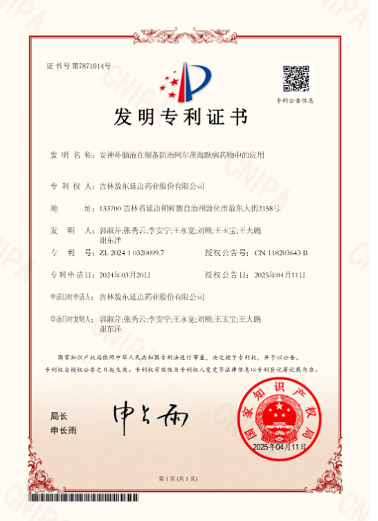 项目团队在二次开发过程中,成功获得《安神补脑液在制备防治阿尔茨海默病药物中的应用》及《安神补脑液在制备治疗抗衰老药物中的应用》两项中国发明专利。这使得安神补脑液成为国内首款同时拥有“抗衰+防治阿尔茨海默病”双功效专利的安神类中药,拉开了与普通同类产品的差距,重新定义了传统中药的价值边界。